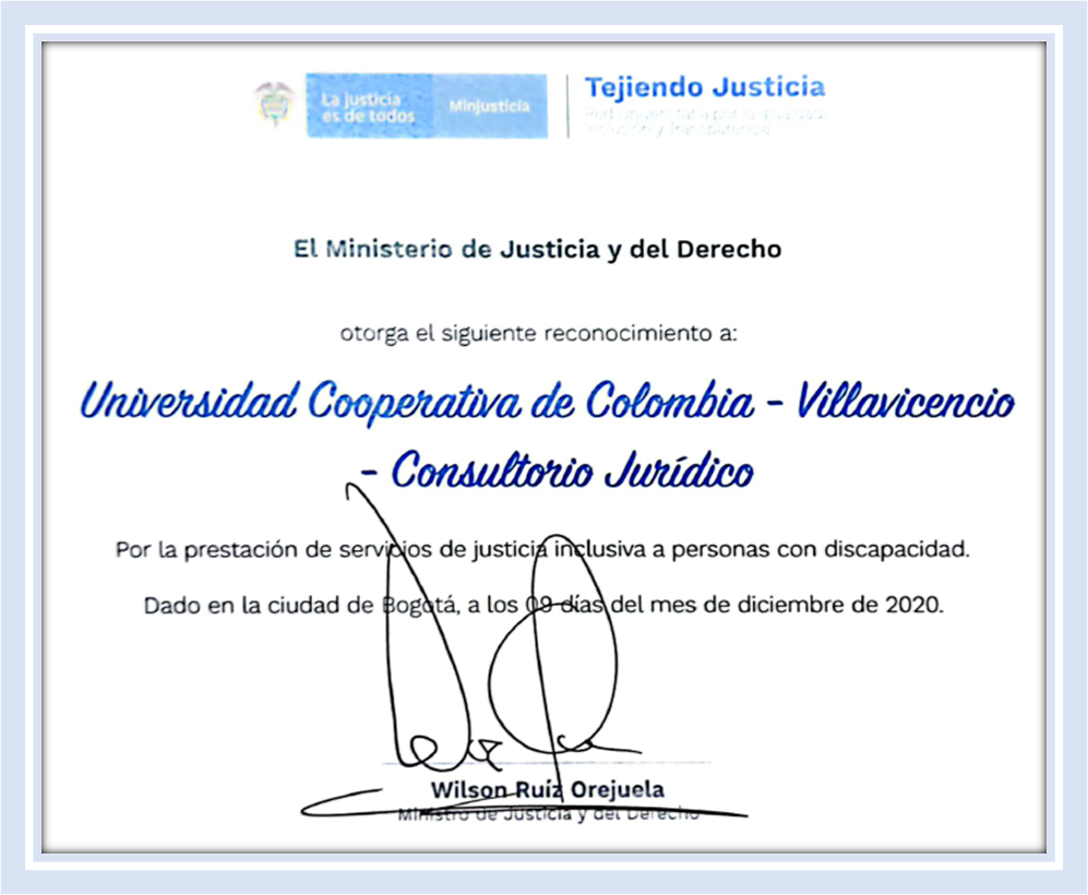 Hemos sido distinguidos y certificados “Por la presentación de servicios de justicia inclusiva a mujeres y personas LGBTIQ+" y “Por la prestación de servicios de justicia inclusiva a personas con discapacidad", por parte del Ministerio de Justicia y del Derecho en diciembre de 2020.